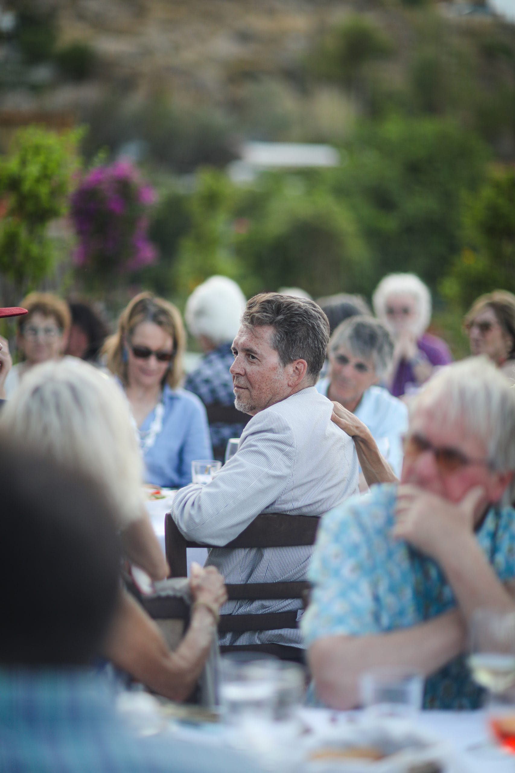 you are truly away from hurried, scheduled time and from travel as tourism. The ten days of Salon are structured spaciously — a wonderful mix of conversation and concentration and learning, and exploring and resting and play. The food and wine are fresh and lovely. The waters of the Aegean are indescribably lovely to gaze at and swim in. And the ancient speaks audibly to the present in the everyday — Greek mythology embodied and alive alongside the sacred Christian significance of the island.